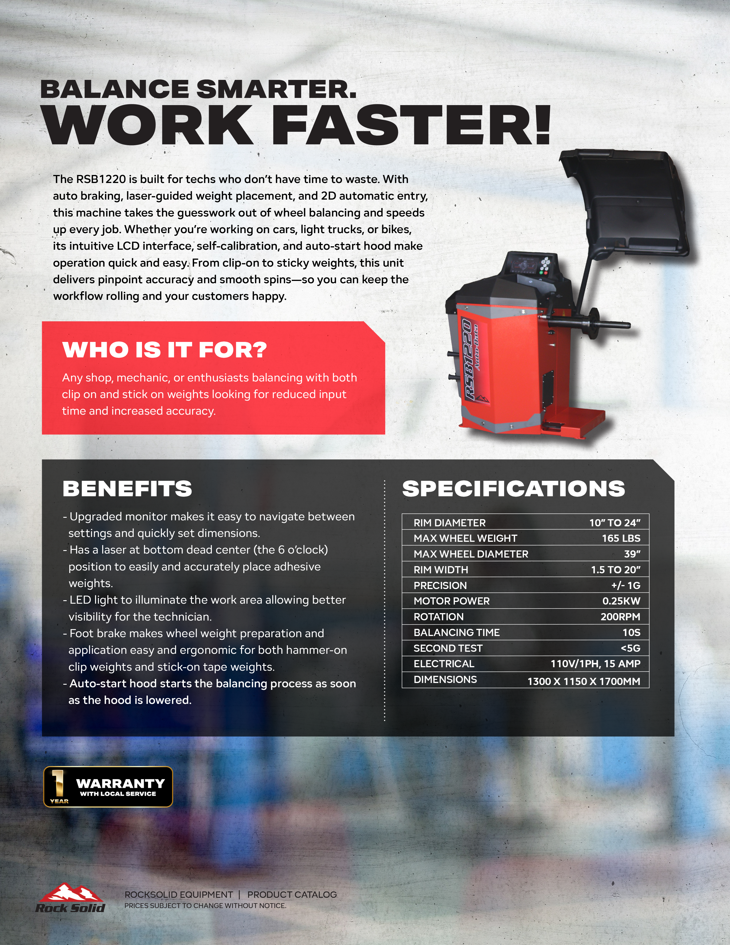 FeaturesThe RSB1220 is built for techs who don’t have time to waste. With auto braking, laser-guided weight placement, and 2D automatic entry, this machine takes the guesswork out of wheel balancing and speeds up every job. Whether you’re working on cars, light trucks, or bikes, its intuitive LCD interface, self-calibration, and auto-start hood make operation quick and easy. From clip-on to sticky weights, this unit delivers pinpoint accuracy and smooth spins—so you can keep the workflow rolling and your customers happy.